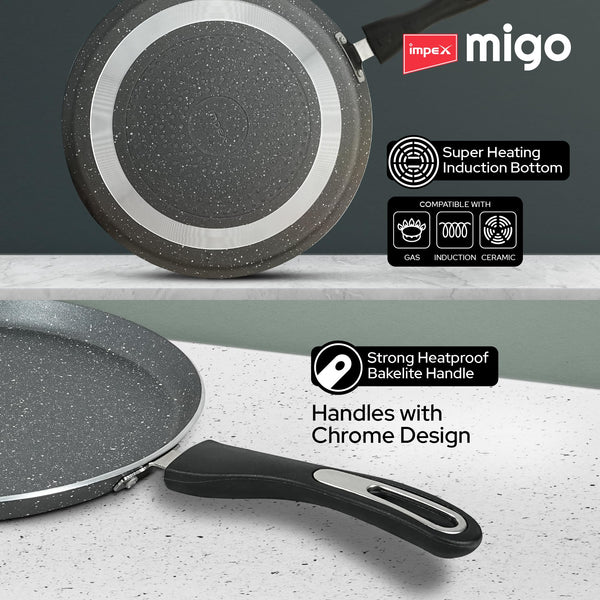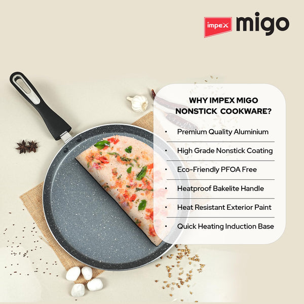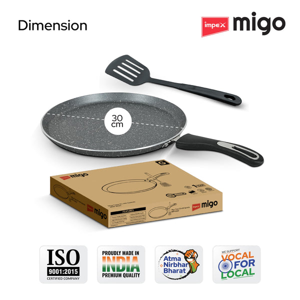 Details: Introducing the Impex Non Stick Tawa Pan, a versatile and durable addition to your kitchen arsenal. This 30 cm tawa pan is designed with an induction base, making it compatible with both induction and gas stoves. Crafted from high-quality aluminium, it boasts a granite finish that not only looks sleek but also ensures even heat distribution for consistent cooking results. The non-stick coating allows for effortless food release and easy cleaning, while the included spatula adds convenience to your cooking experience. Whether you're whipping up delicious dosas, sizzling parathas, or searing meats and vegetables, this multi-purpose tawa pan is a versatile workhorse. Its sturdy construction and heat-resistant handle ensure a comfortable and safe grip, even during extended cooking sessions. Embrace the joy of hassle-free cooking with the Impex Non Stick Tawa Pan, your go-to companion for a wide range of culinary delights.