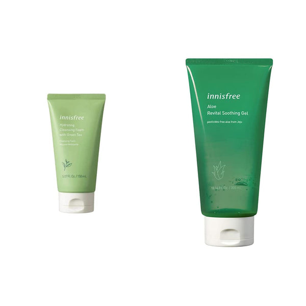 Details: Innisfree Green Tea Foam CleanserRefreshing and hydrating cleansing foam with Jeju green tea extract while it whisks away dirt and impurities.Innisfree Aloe Revital Soothing GelThis soothing gel for face and body is formulated with Jeju aloe extract, hydrates tired-looking skin with moisture for a healthy look.