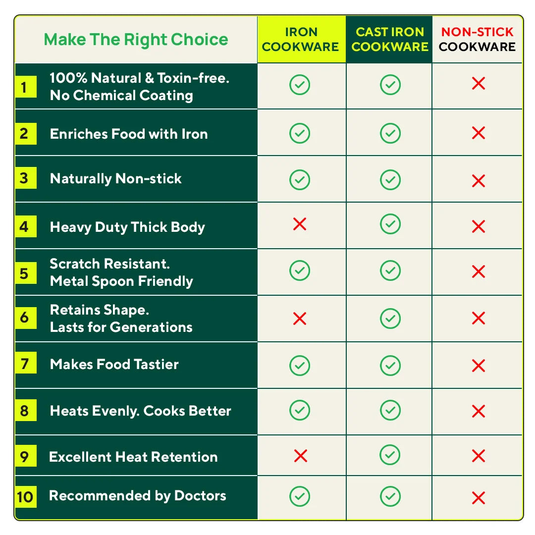 🌿TOXIN FREE COOKWARE: This iron cookware combo is completely food-safe, without any harmful chemical coatings. Thus, it is a healthier alternative compared to any non-stick utensils.