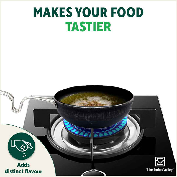 🌿100% NATURAL & TOXIN-FREE: The Indus Valley Pure Iron Tadka Pan with Stainless Steel Handle is 100% food-safe and toxin-free. Made from pure iron, with no chemical coating.