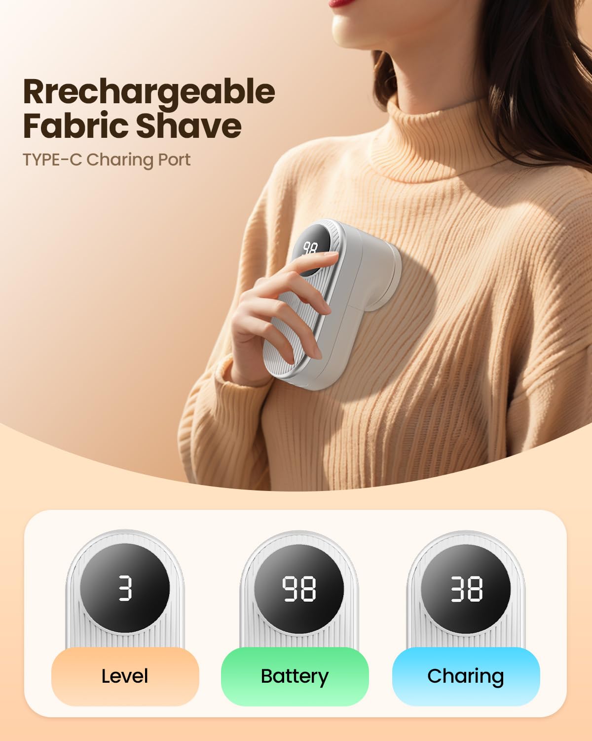 - 【LED Display & 3 Speeds Setting】This electric sweater defuzzer is equipped with a display, which will display the remaining power and speed gear on the screen, which is convenient and intuitive, and you can view the power at any time and charge it in time. Three speed settings, the gear can be adjusted according to the type and thickness of the clothes (1st gear: light clothing, 2nd gear: sweaters, 3rd gear: coats).