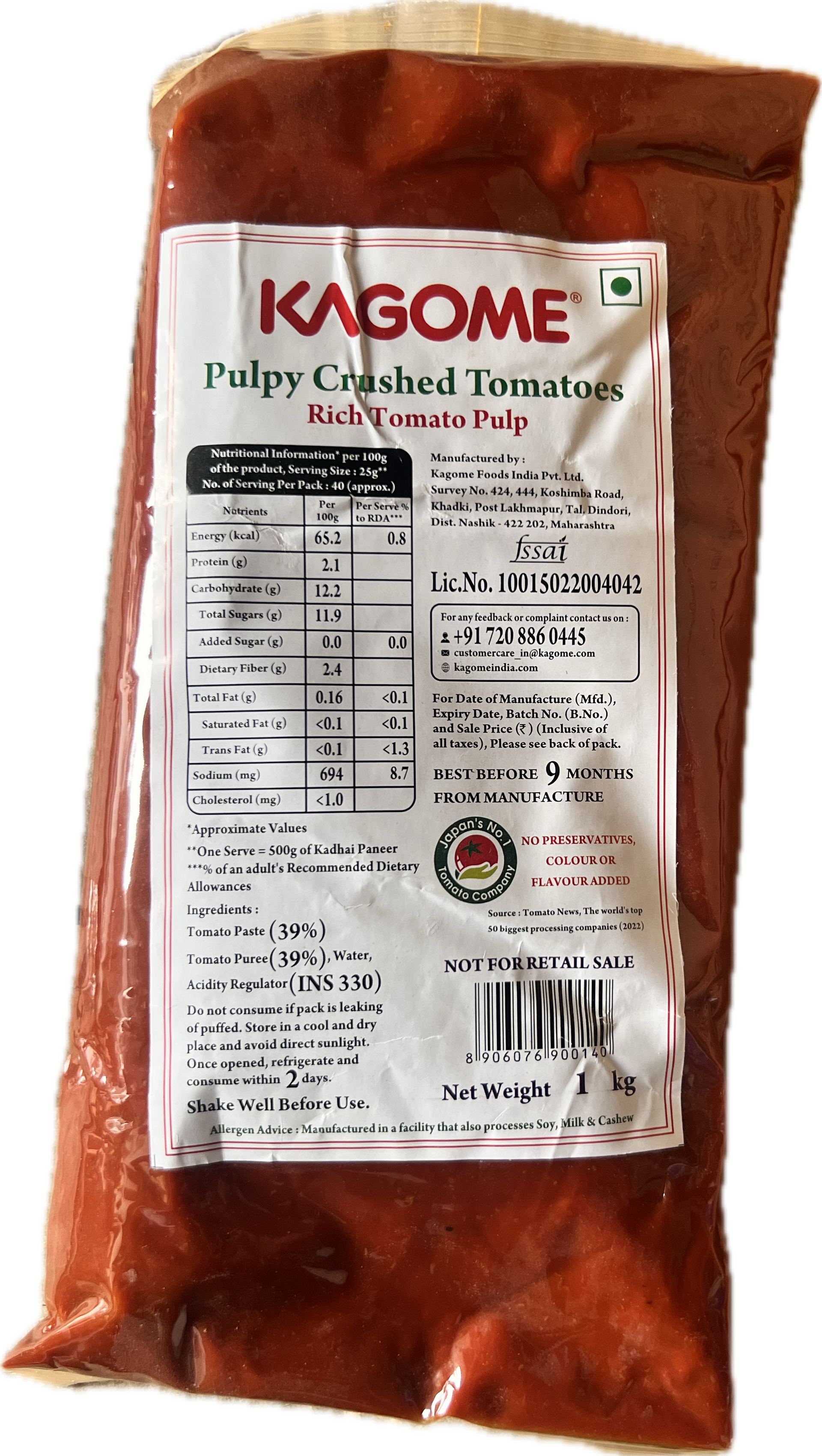 Introducing Kagome Pulpy Crushed Tomato, now available in a convenient 1kg package. Made with rich tomato pulp, this crushed tomato is bursting with flavor and nutrients. Perfect for soups, sauces, and more. Experience the difference with Kagome.