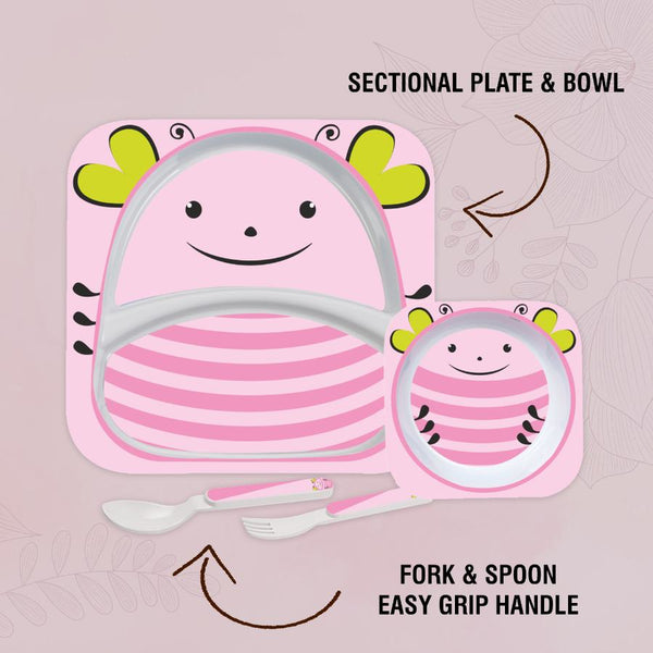 Introducing the Cello Kidzbee Kids Meal Set - a delightful dining experience for little ones! Crafted with care, this set features an adorable Pink lady bug design that's sure to capture kids' hearts. The heightening design of the plate ensures stability, preventing accidental spills on smooth surfaces. Made from high-quality melamine, it guarantees safety and hygiene during mealtime adventures. Lightweight and adorned with charming animal prints, this meal set quickly becomes a kid's favorite. Each set includes a plate, kids bowl, fork, and spoon, all boasting unique patterns that add a touch of whimsy to every bite. Ideal for gifting to friends, family, or colleagues, the Cello Kidzbee Kids Meal Set combines functionality with cuteness to make mealtime enjoyable and exciting.
