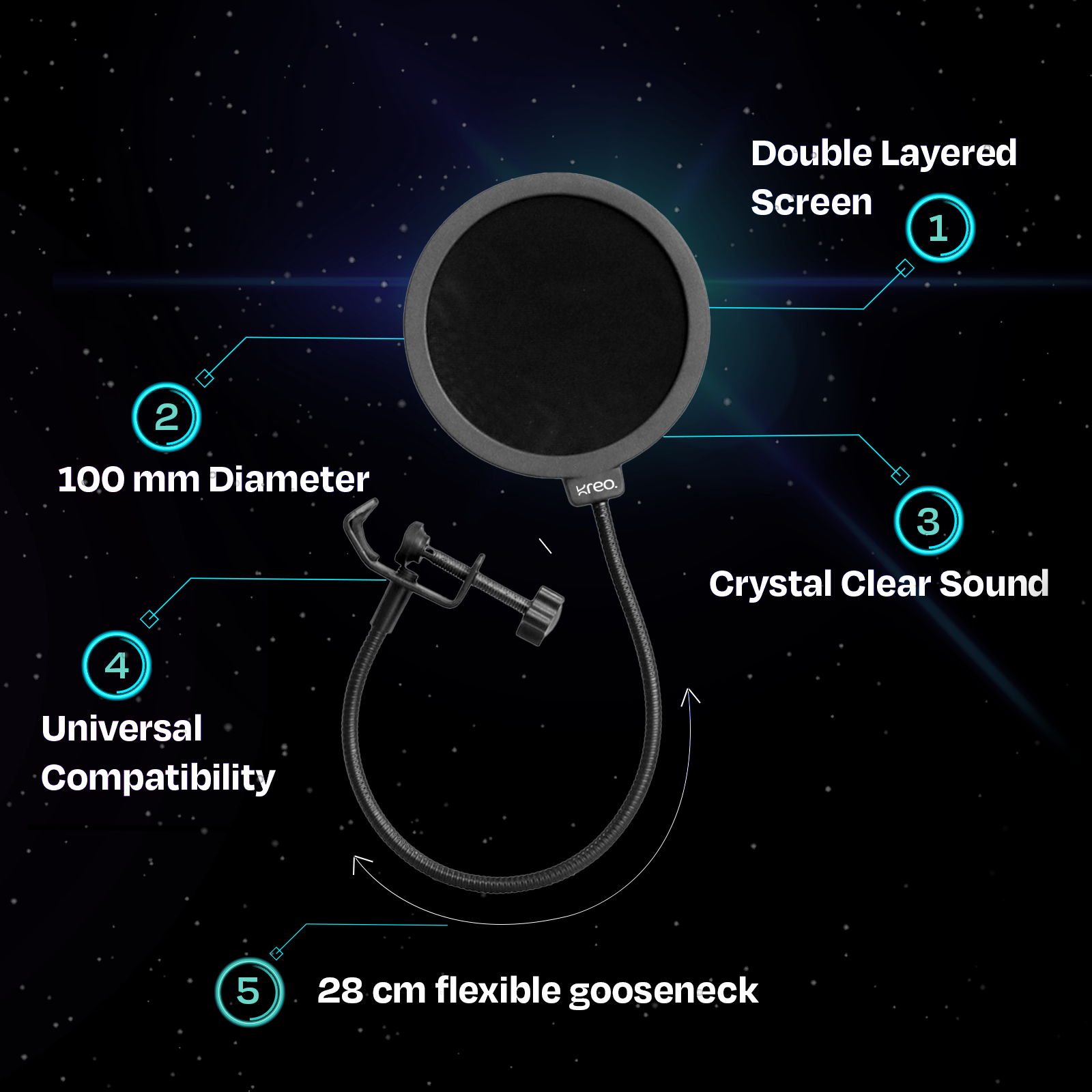 - Double Layered Pop Filter to effectively filter air blasts ensuring there is no popping and hissing sound for crystal clear audio.