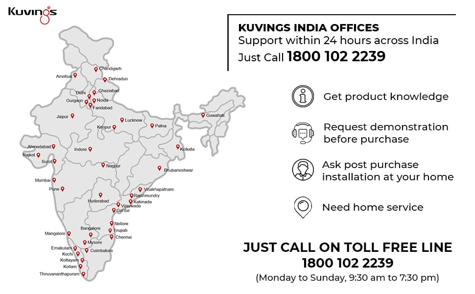- FREE HOME INSTALLATION & FREE HOME SERVICE: We, at KUVINGS INDIA, are committed to "Keep Customers Interest Ahead of All." Feel free to contact Customer Care at 1800 102 2239 for Installation or Service Requirement. With our 18 offices across India, we provide door-step service to all our users.