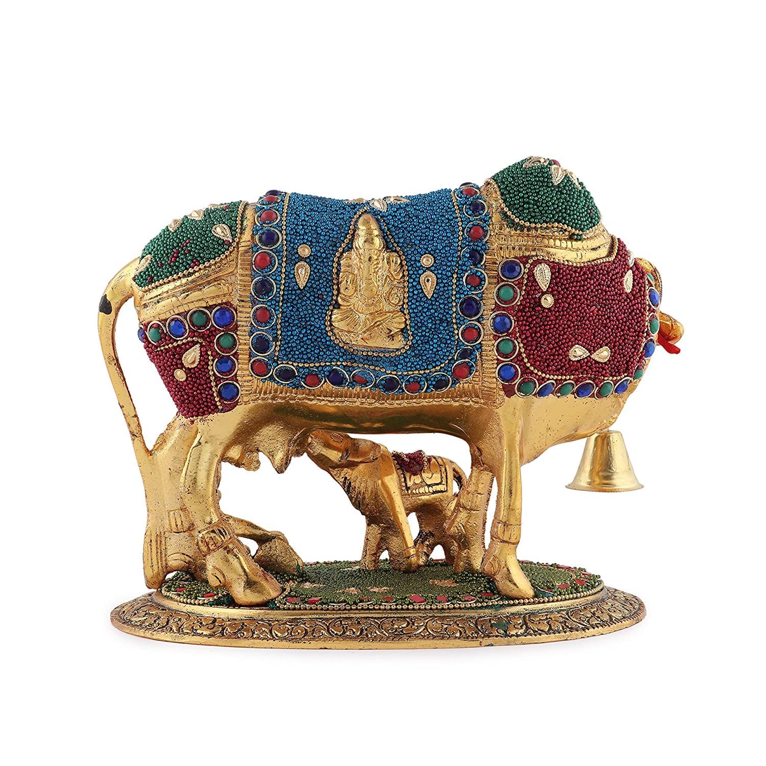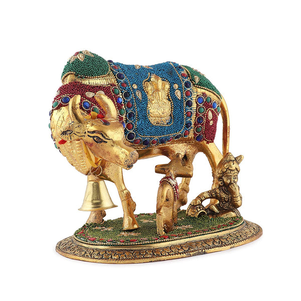 LABHCART Handcrafted Brass Golden Kamdhenu Cow with Calf, Vastu Gau MATA Idol, Spiritual Vastu Nandi Pooja Figurine Sculpture, Kamdhenu Cow & Calf Idol for Home and Office