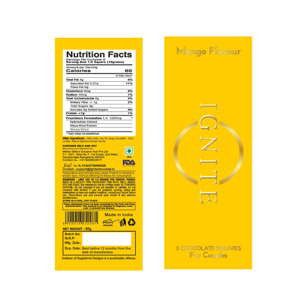 - Boosts Holistic Health: Ignite's chocolates do more than just uplift your mood. These treats are tailored to provide support for both men and women, improving wellness, intensifying responsiveness, and fostering a sense of balance. Enjoy a deeper, more fulfilling experience with every bite.