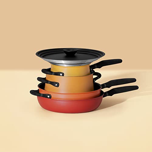 - SPACE SAVING MAGIC: From the pots to the pans, we've designed our cookware so that it nests together seamlessly. When stacked together, this set of cooking essentials gives you a beautiful color gradient and keeps your kitchen neat as a pin.