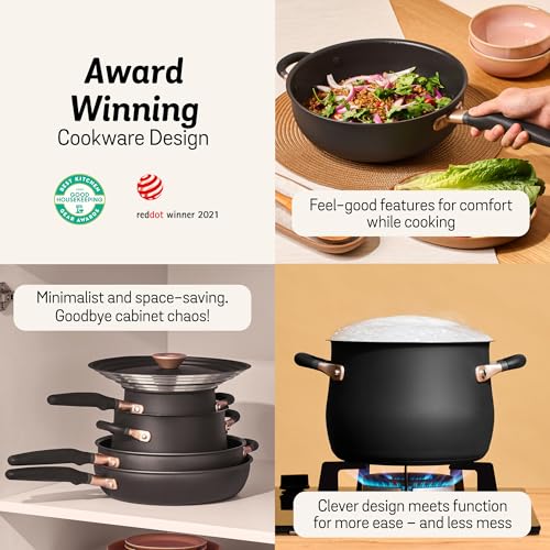 - NO MORE CABINET CHAOS: Unlike so many other cookware sets, our pots and pans are designed to stack beautifully together, creating a gorgeous color gradient and stress-free storage, and the set includes three pan protectors to keep your surfaces free from dents, dings, and scratches. You're welcome.