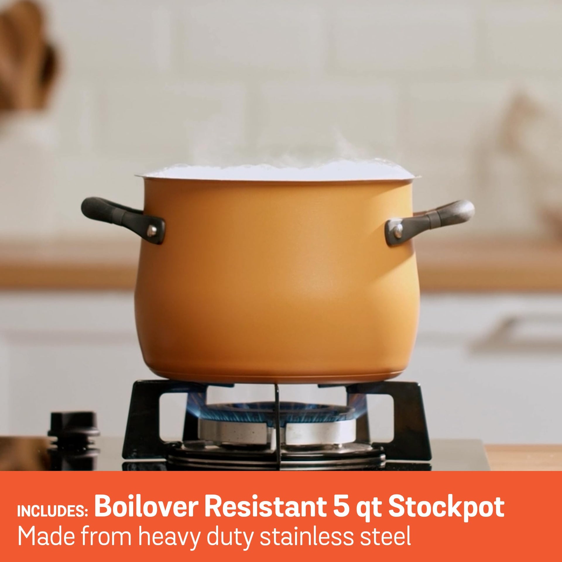 - WHAT'S INSIDE: 2-quart yolk yellow nonstick saucepan, 5-quart pumpkin orange stainless steel stockpot, 10.25-inch persimmon orange nonstick chef pan, 11-inch chili red nonstick frying pan, small universal stainless steel lid (fits saucepan and stockpot), large universal stainless steel lid (fits chef pan and frying pan), and 3 pan protectors.
