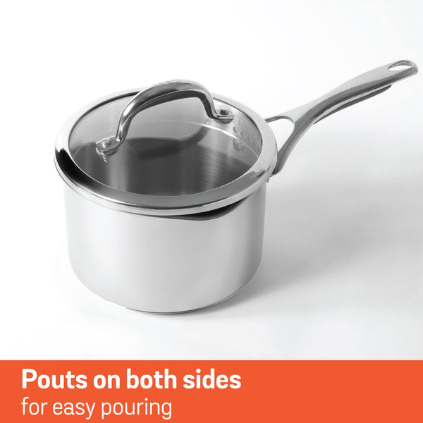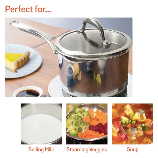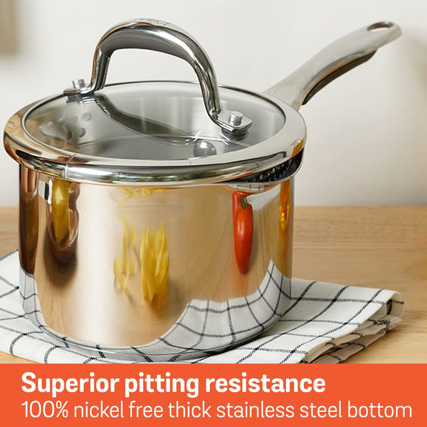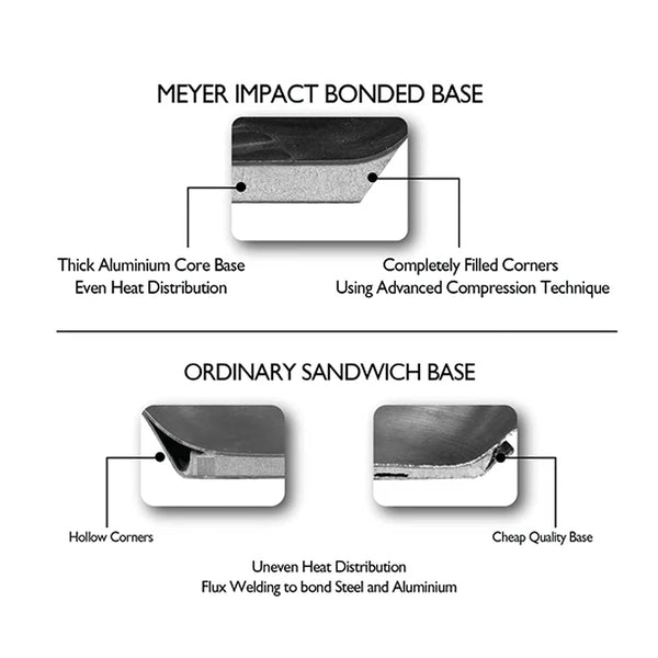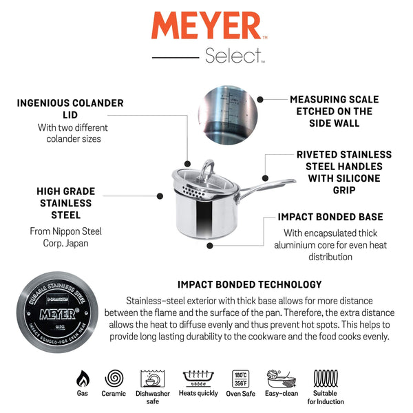 Details: High grade FW2 stainless steel from Nippon Corp. Japan that will last you with ultimate strength and durability as it has superior pitting resistance than any other ordinary stainless steel cookware. Impact bonded base for even heat distribution. Ingenious colander lid for ease of straining from the vessel. Measuring scale etched on the side wall for accuracy and convenience. Suitable for all cooktops including induction. Shatter resistant Colander glass lid. Cast stainless steel riveted handle with silicone grip, for easy and comfortable grasp. Our manufacturing spread across the globe creates over 300 cookware lines that are distributed in over 60 countries. Meyer provides a warranty of 10 years on its Select range.