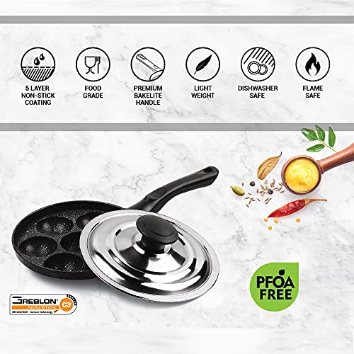 Details: The appam patra comes Uniquely designed for special dishes like Appams, Paniyarams Kuzhi Panniarrams, Puddus, Gunta Ponganalu, Neyyappam and other batter based delicacies. The Appam Patra comes with 5 layer food-grade non-stick coating which enhances both durability and cooking performance. The non-stick coating help in cooking with minimum oil or butter. As the food does not stick to the surface and can be easily scooped off. So it ensures hassle-free healthy cooking without spoiling the taste of the food. It comes with Bakelite handle that helps you lift the hot pan without the use of mittens or a cloth. Bakelite is poor conductor of heat so would not burn even when exposed to high heat.