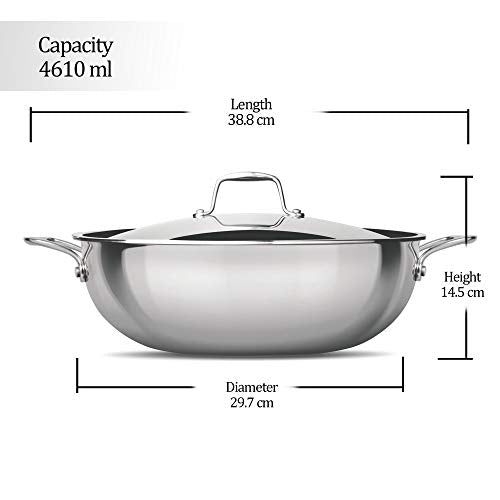 Details: With Tri-Ply Stainless steel cookware, get both beauty and performance while tackling your culinary needs. Cook-up a storm with this technology that faciliates even distribution of heat. Handling and maintenance comes easy with this stain and stick resistant range. The air fin handle of the Kadhai makes lifting, pouring and cooking convenient. You can use it to boil, heat and reheat a variety of food. Using the lid helps retain the heat in the pan and thus accelerate the process of cooking evenly. Cook faster, healthier and happier in this beautiful piece of art. The cookware range wins on aesthetics and thus can be taken directly to the dinner table from the hob. Compatible with all heating sources like induction, gas, hot plate, it is easy to clean. Ideal for cooking curries, gravy dishes, etc.