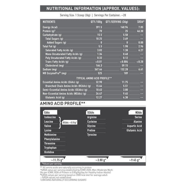 - ENHANCED ABSORPTION FORMULA (EAF): MB Biozyme Performance Whey Protein ensures 50% higher protein absorption & 60% superior BCAA absorption compared to other whey protein supplements. This proprietary formulation of MB is international patent-applied & lowers any possible protein digestion issues