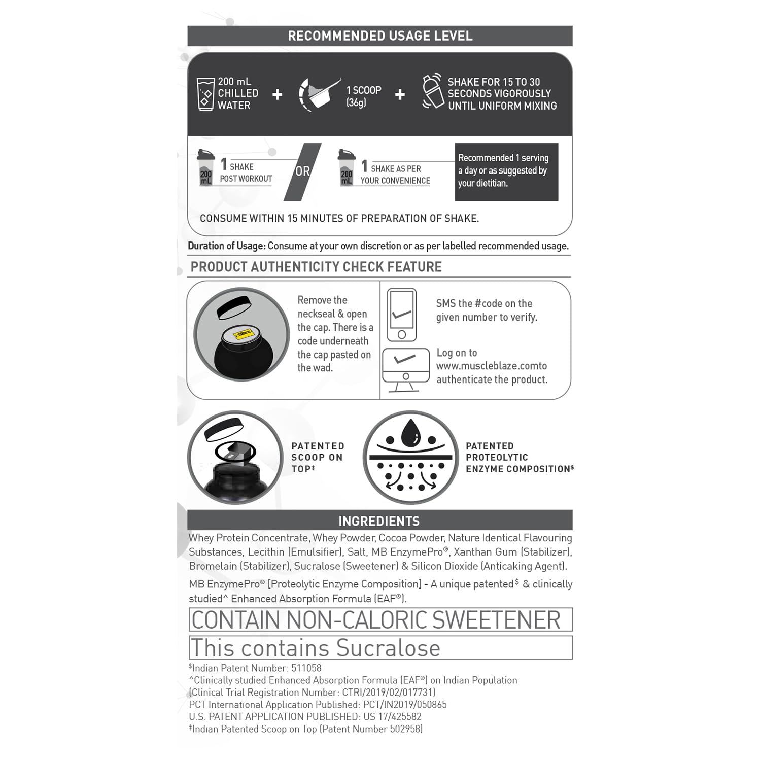 - INFORMED CHOICE, UK, LABDOOR, USA & TRUSTIFIED- TESTED & CERTIFIED: MuscleBlaze Biozyme Whey Protein has been regularly & rigorously tested, certified by Informed Choice Program U.K., Labdoor USA, Trustified for Accuracy of label Claims (Protein content, no amino spiking) & Purity (free from heavy metals or biological contaminants)