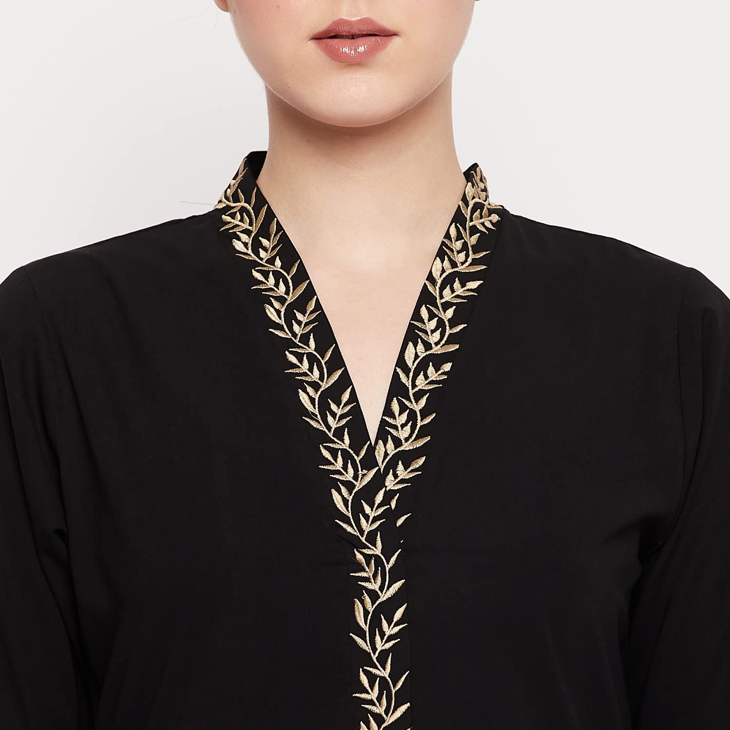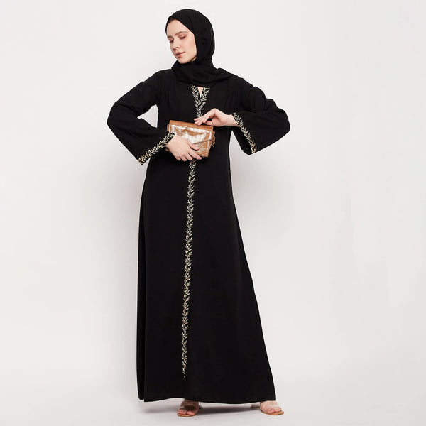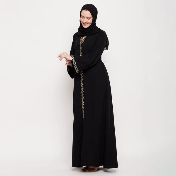 Nabia Black Solid Abaya Burqa, has V- neck, full sleeves, slip-on closure and flared hem