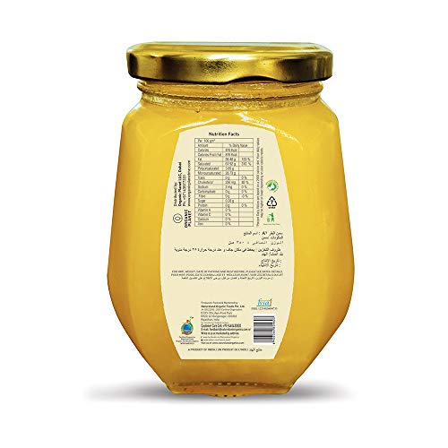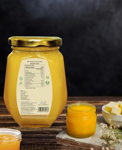 Details: Natureland’s traditionally processed pure organic Indian desi cow ghee made by churning the curd, the process which gives it natural unique aromatic flavour and texture, since this is prepared from curd which has natural human friendly bacteria, it digests easily in our digestive system, it gives extra fresh oxygen to the blood which rejuvenates us, elevates our mood apart from this our curd based traditionally processed ghee has preventive as well as curative attributes. It aids in digestion, improves IQ levels, balances hormones. It has also antiviral and anti cancer properties which comes from its butyric acid content and it is excellent for brain development in kids, pregnant and lactating women, elderly and young. Pure natural cow ghee.