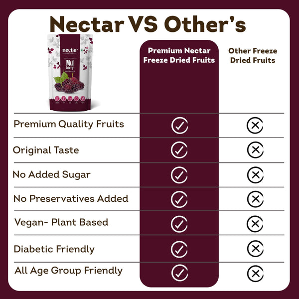 - DAILY FRUIT DOSE: With Nectar Superfoods Freeze Dried products it gets easy to consume complete daily recommended dosage of fruits in our diet. With No Hassle of cleaning, sorting, peeling or cutting of fruits the freeze dried options becomes very convenient