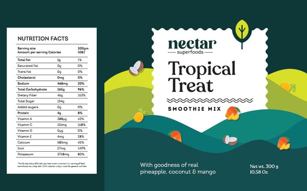 Nectar Superfoods Freeze Dried Tropical Treat Smoothie Powder - Added 100% Natural Fruits , Mango, Pineapple & Coconut, Healthy Ingredients for Nutritious Smoothies, Vegan & Convenient - 15g Sachet Pack