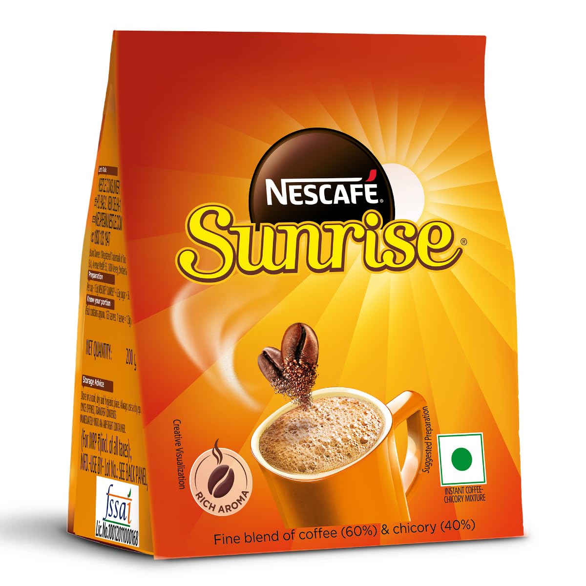 Details: "Start your day bright with NESCAFE SUNRISE! It all starts with handpicked beans from coffee farms in South India. These coffee beans are SLOW ROASTED to develop the perfect aroma, which is retained using our world-class expertise and captured in RICH AROMA GRANULES. Enjoy the great aroma and taste in every cup with NESCAFE SUNRISE. Usage: Simply follow the instructions on the back of the pack and mix the coffee granules to hot water, sugar and milk to release the rich aroma in your cup every morning. Storage Information: On opening, transfer the contents of the pack into an airtight container. Always use a dry spoon. "