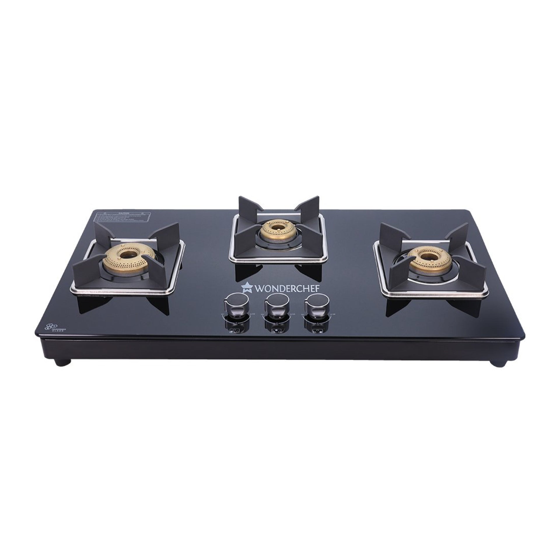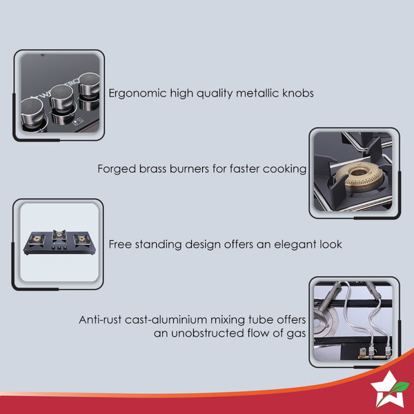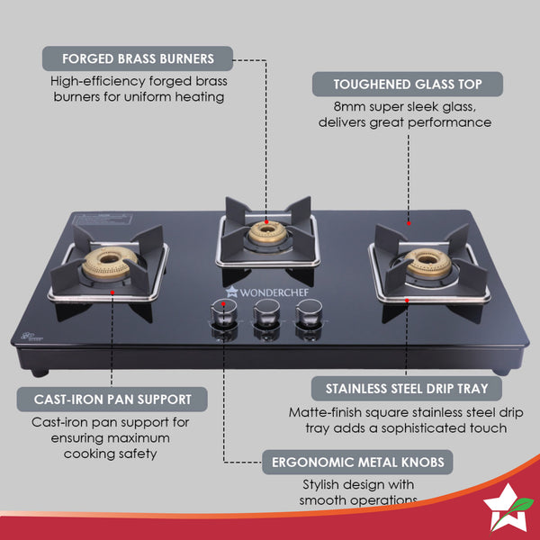 Octavia 3 Burner Glass Hob Top Manual Cooktop | 8mm Toughened Glass | Manual Ignition | Forged Brass Burners | Stainless Steel Drip Tray | Anti-Skid Legs | Large & Heavy Pan support | LPG compatible | Black steel frame | 2 Year Warranty | Black