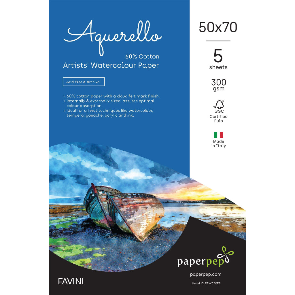 Paper Pep Artists' Aquerello 60% Cotton Watercolour Paper 300GSM Cold Pressed 50X70CM Pack of 5
