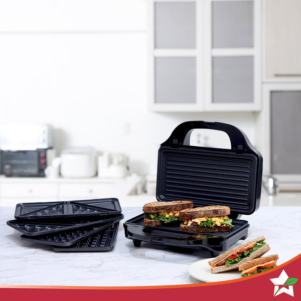 - VERSATILE 3 IN 1 SANDWICH MAKER: Designed to cater to all your breakfast needs; this multi-purpose machine features three detachable plates for sandwiches, grilling, and waffles.