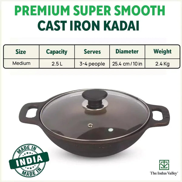🌿100% NATURAL & TOXIN-FREE: The Indus Valley Super Smooth Cast Iron Kadai (Wok Kadhai) is 100% pure cast iron. No chemical coating like nonstick cookware.