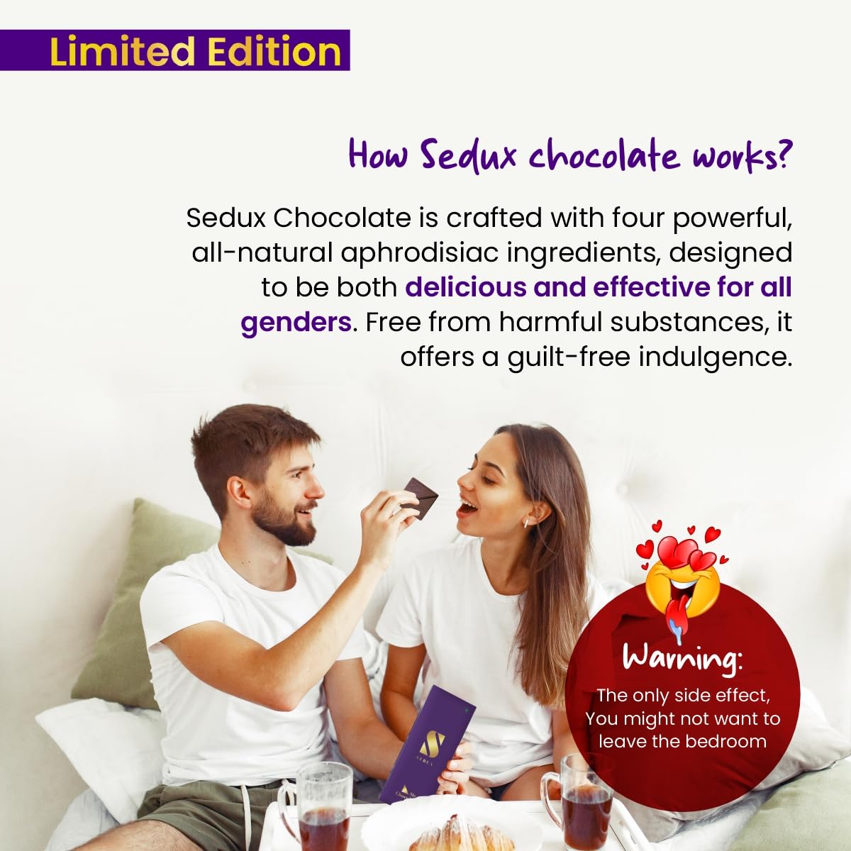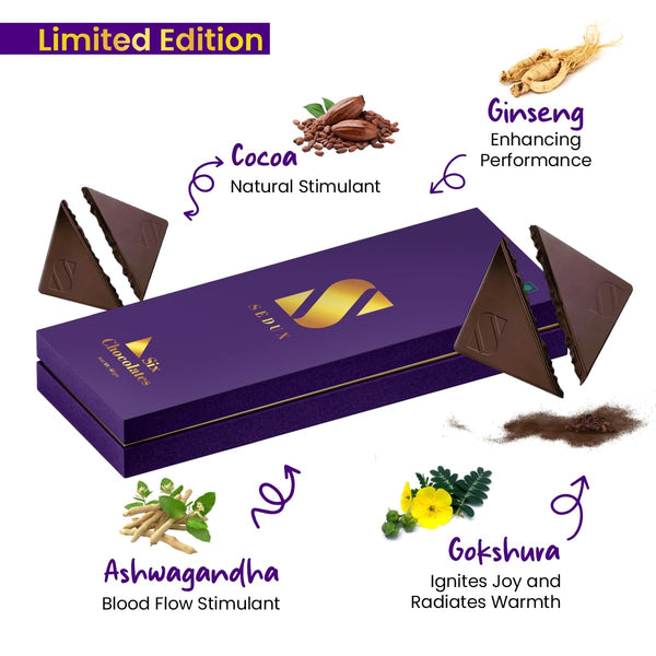 - ✔ Ginseng – A Timeless Root A popular herb in Eastern traditions, often used in wellness routines. Adds a mild earthy note that enhances the chocolate’s richness. Recognized for its historical significance in herbal practices. ✔ Gokshura – Nature’s Wonder Fruit A treasured herb in traditional formulations with other botanicals to create a well-rounded experience. A natural addition to enhance the sensory appeal of Sedux Chocolate