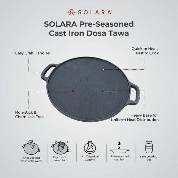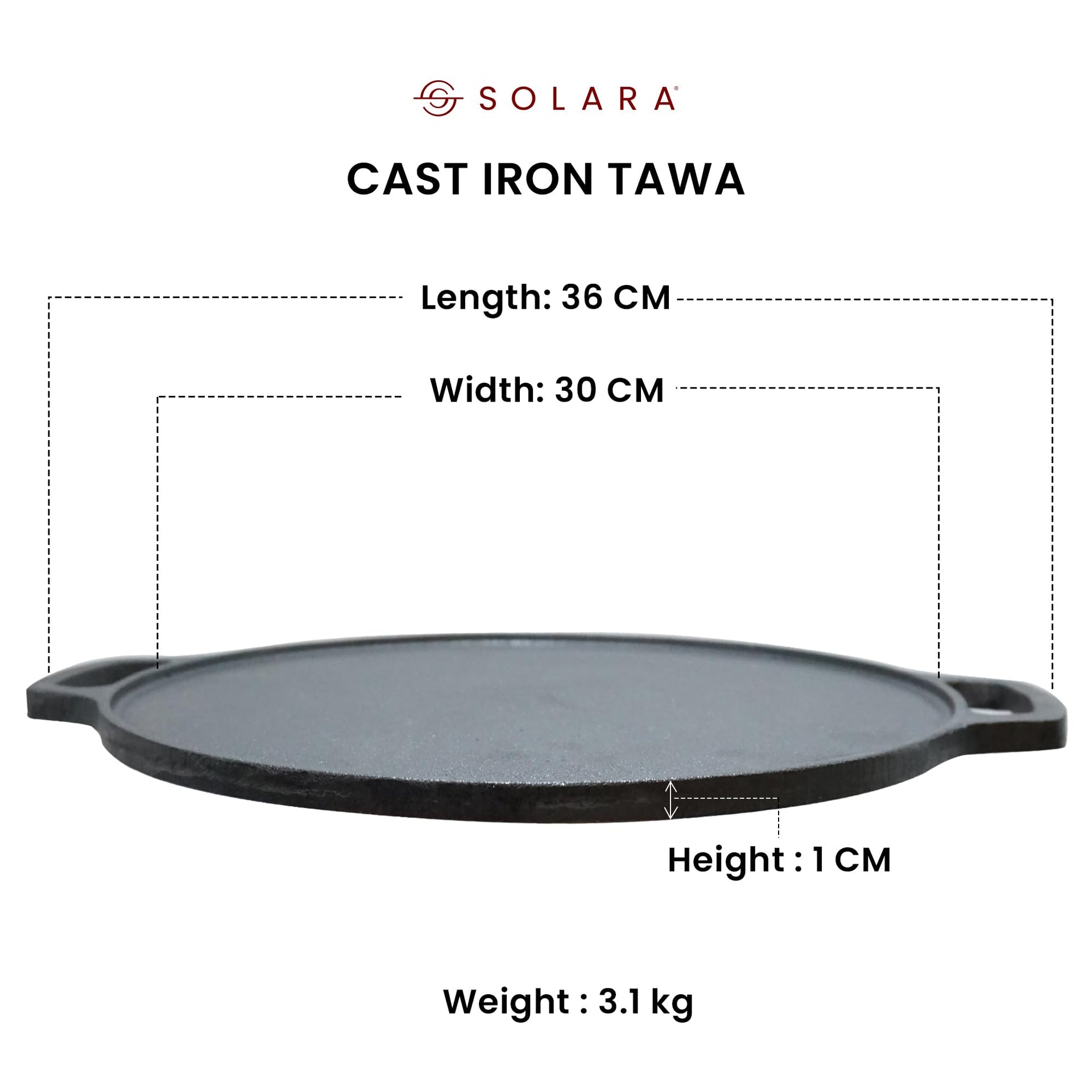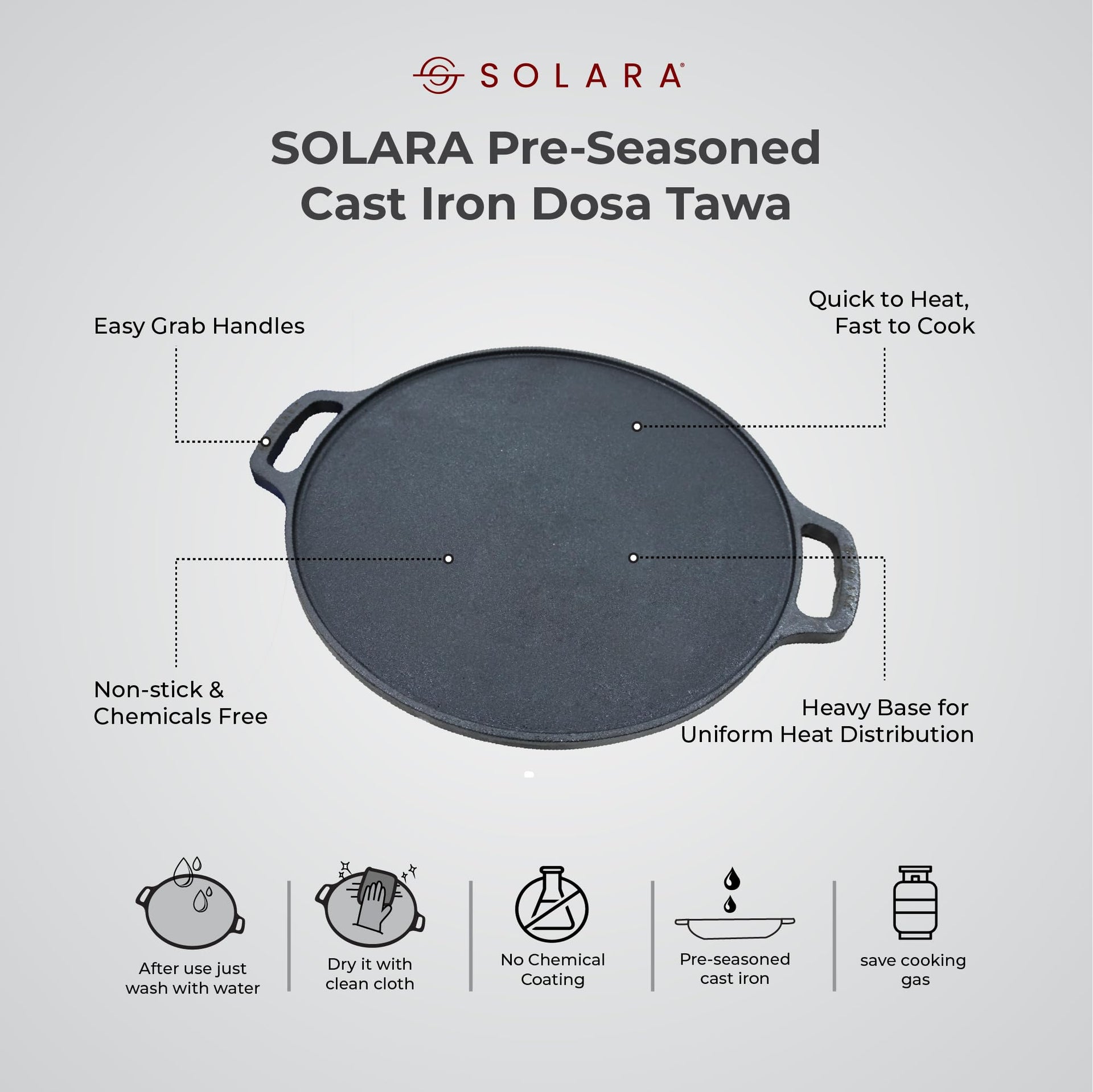 SOLARA Cast Iron Tawa for Dosa 12" Inch(30 CM), Tawa for Dosa, Uthappam, Roti, Chapati, Naan, Gas & Induction Friendly, Dosa Tawa Cast Iron, Cast Iron Cookware