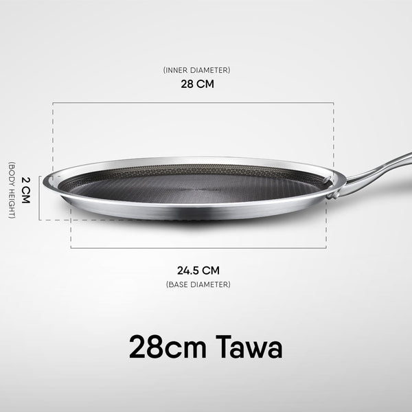 Details: The Stahl Artisan Hybrid Tawa is the best dosa tawa because of its stick resistant technology, chip-proof coating and less oil consumption. HexaRidge Technology: This tawa has a German technology Greblon coating which is embedded in a honeycomb structure. The ridges of the honeycomb structure are elevated so that there is no contact of the spatula on the stick resistant tawa, giving it five times the life of any other coated tawa on the market. You can use a metal spatula on it, or even a knife! The Stahl Artisan Hybrid Tawa, is made of triply technology. This tava can be used on an induction base as well as a stove top. It is manufactured with utmost care and precision, ensuring an impeccable feel and finish, with great utility and heat efficiency. Great to Make : Dosas, Chillas, Crepes, Pancakes, Parathas, Omelets.