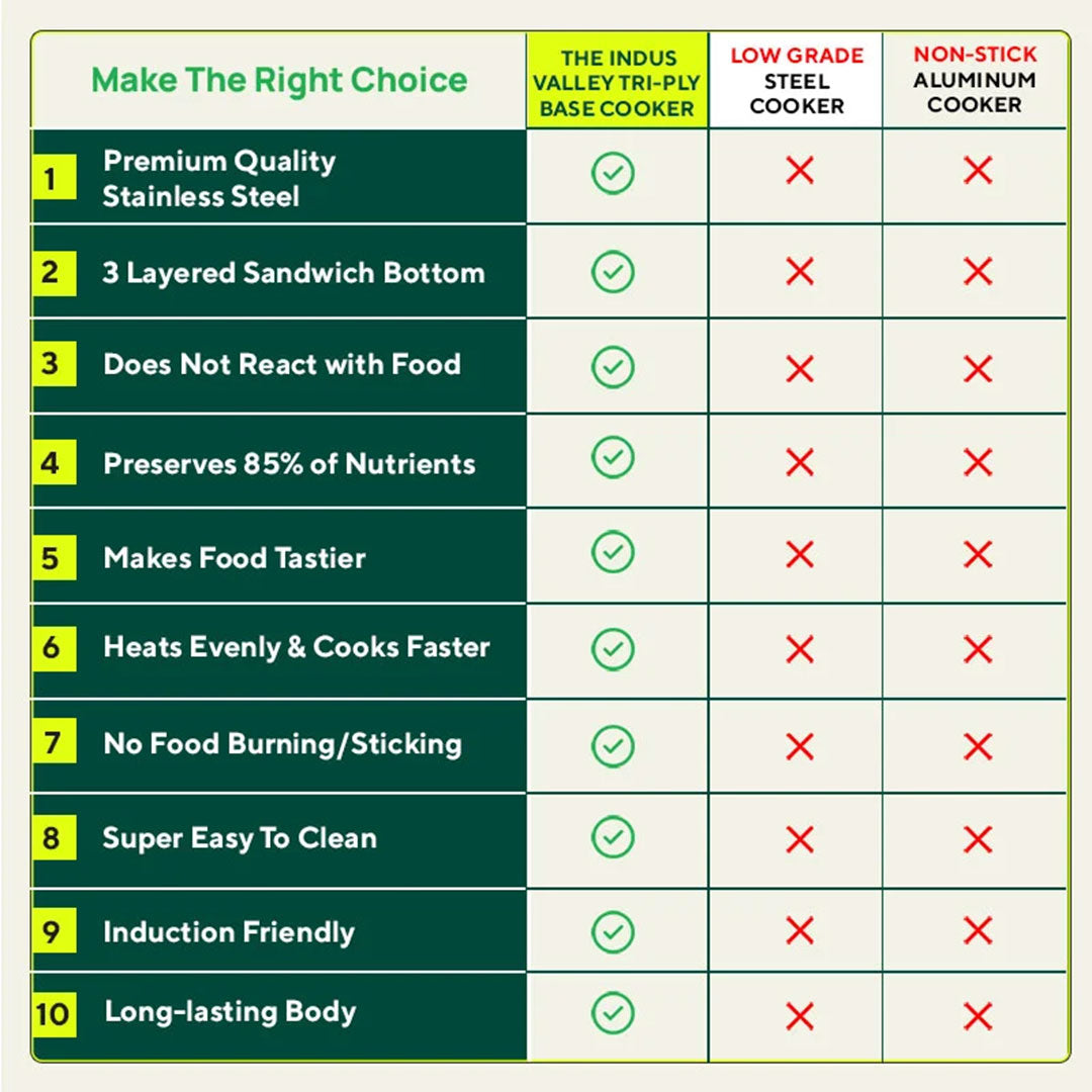 The Indus Valley Premium Stainless Steel Outer Lid Triply Bottom Pressure Cooker is made of 100% food-safe metals. The outer lid cooker is ISI certified and comes with a 3 years warranty.