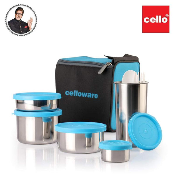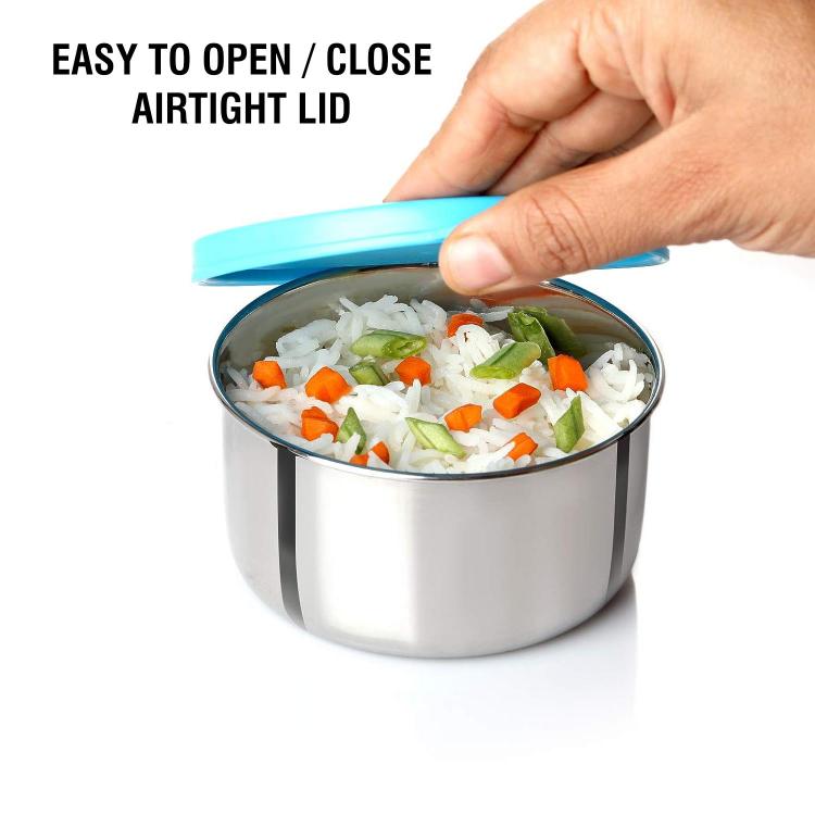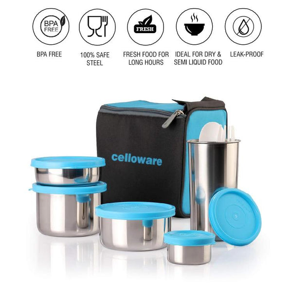 The Steelox Steel Lunch Box Combo, Set of 4 and Set of 5, in its captivating blue color, presents a holistic solution for your lunchtime needs. Included in this set is a practical bag designed with college or office use in mind, ensuring your lunch remains organized and fresh even on the busiest of days. Crafted from robust stainless steel, these tiffin boxes are built to endure daily use, establishing themselves as a dependable choice for your meal requirements.