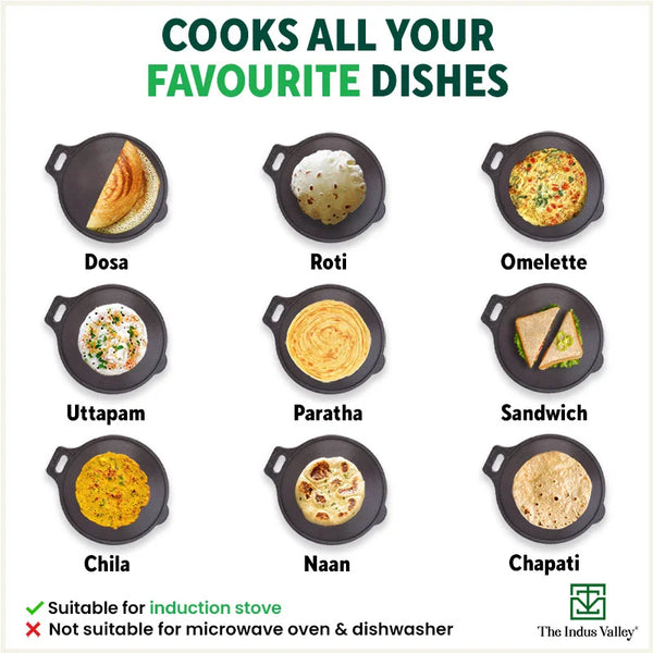 This super smooth cast iron tawa makes restaurant-like dosas, parathas, naan, omelettes, uttapams, etc. The gas / induction cast iron tawa cooks faster and also saves gas. Plus, this cast iron tawa will last for generations.