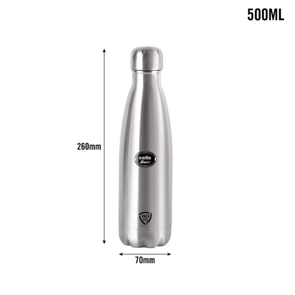 Introducing the Swift Flask by Cello, a 500ml Vacusteel water bottle engineered for optimal temperature retention, perfect for both hot and cold beverages. Its classic design features a small mouth and neck to enhance heat preservation, ensuring icy cold drinks and piping hot beverages stay refreshingly refreshing. The modern click-press inner lid, backed by Thermo-seal technology, seals in heat, while the small mouth allows spill-free drinking and pouring. Compact and sleek, it's your ideal companion for modern-day living.