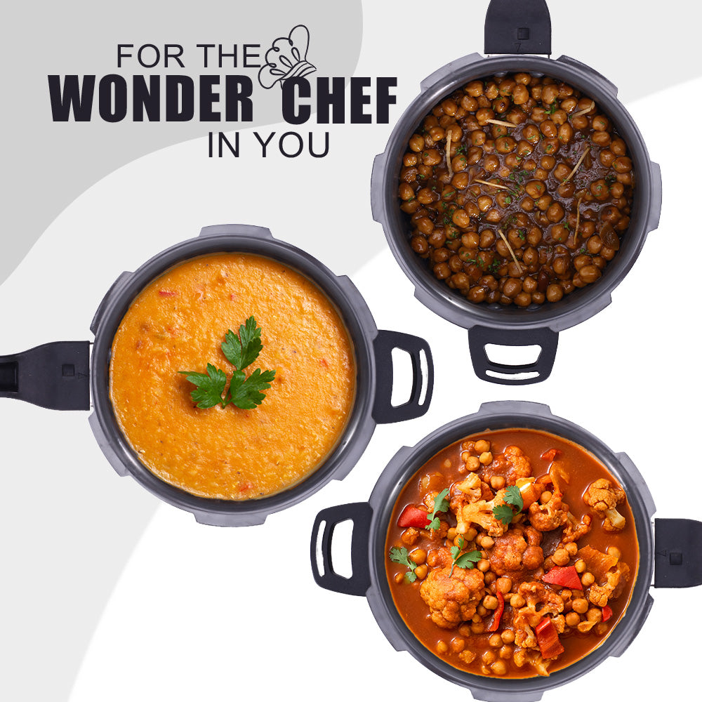 Unlock a world of culinary possibilities with the Wonderchef Taurus Black Hard Anodized Pressure Cooker. Crafted to perfection, this kitchen marvel stands as the ultimate solution for all your daily cooking needs - be it steaming idlis, cooking biryani, dal, curries, making cakes and much more!