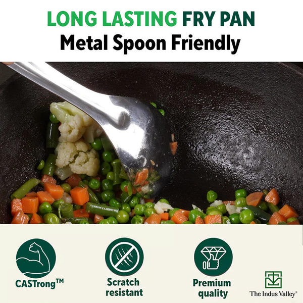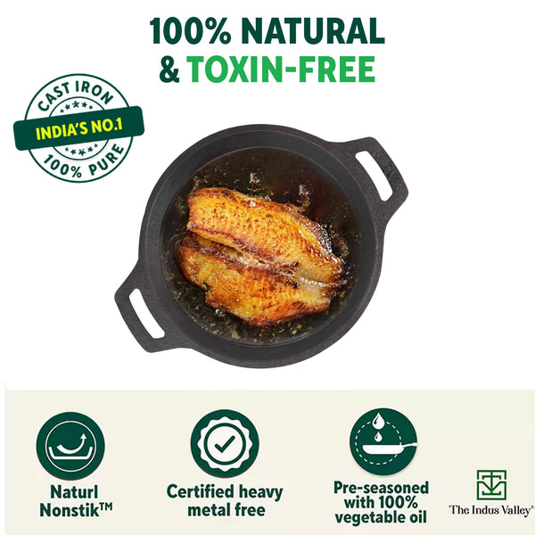 The Indus Valley’s Cast Iron Fish Fry Pan will get you a lip-smacking and perfectly cooked dish. Whether it is fish, veggies or anything that requires a generous amount of frying, this pan will do wonders. The Indus Valley cast iron fry pan is a gas stove and induction safe. It is suitable for all Indian kitchens. All our cookware is made in India. Your purchase is making a huge change for the hands that make it. Thank you!. It is easy to use and can be used right out of the box. It is made to maximize your comfort. It is suitable for shallow frying all food like vegetables, fish, and other items. It is a versatile and healthy frying pan for you and your family.