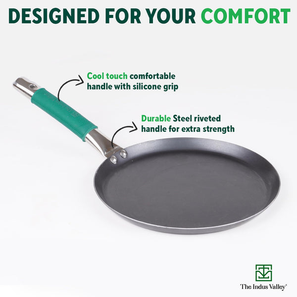 - 🌿100% NATURAL & TOXIN FREE: The Indus Valley’s Pure Sheet Iron Concave Roti/Chappati Tawa is made from 100% pure iron. Thus, this iron roti tawa with handle is food-safe and toxin-free. It is a healthier alternative to non-stick tawa that is generally covered with harmful coating. Do you wish to buy tawa online that is safe for your and your family’s health, then get this amazing tawa from The Indus Valley!