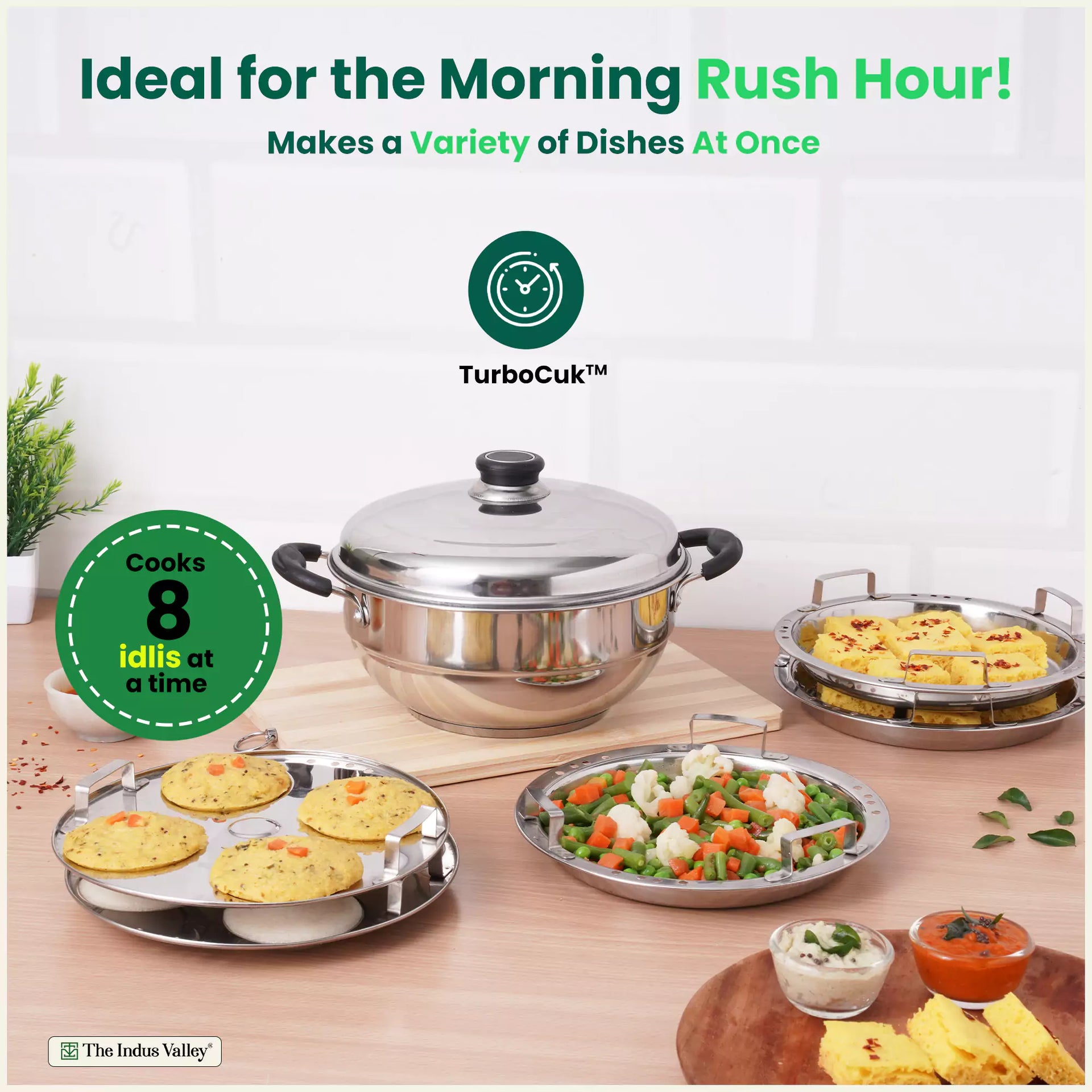 πͺ100% FOOD SAFE: The Indus Valleyβs Premium Stainless Steel Idli Pot/Multi Pot/Steaming Set with 5 Plates is 100% toxin-free. It has no chemical or artificial coating.
