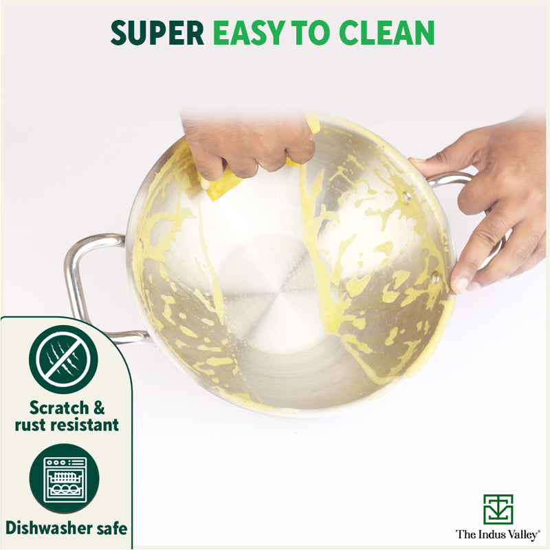 👌MULTI-PURPOSE: Besides being gas stove friendly, the stainless steel kadai has an induction base too. Cooking healthy food in this triply kadai is thus easier, hassle-free and without any chemicals!