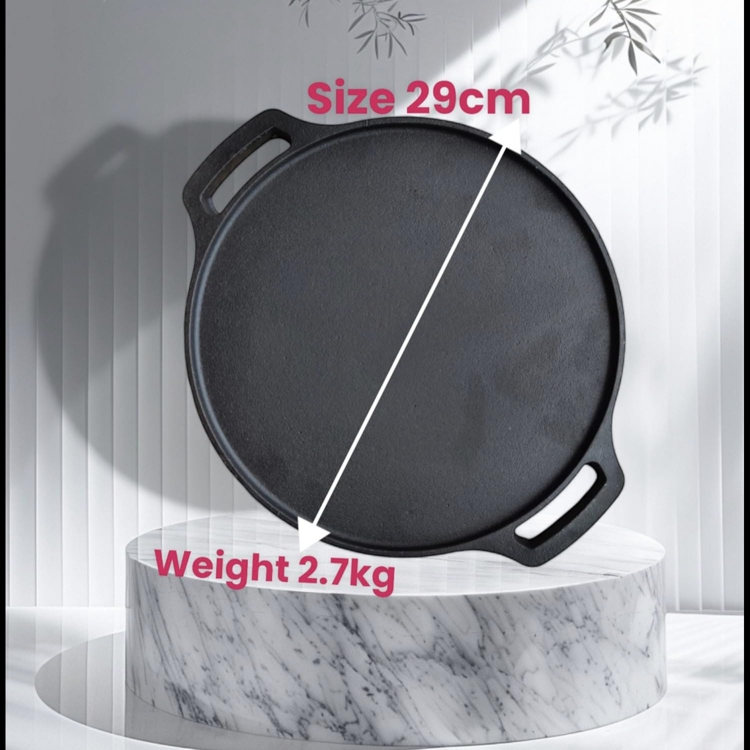 Details: This tawa is ideal to prepare chapatis, rotis, or shallow crispy Dosa, set Dosa, chapati, phulka and paratha. Made with heavy-duty cast iron this tawa is sturdy and long-lasting. Care should be taken to use only heat-resistant silicone, plastic or wooden spoon /spatula for cooking. Metal spoon/spatula should be avoided. The heat retaining properties of cast iron helps to keep the food warm and distributes the heat evenly . Before first use, rinse the Darkpyro Cast Iron Tawa with hot water and towel dry thoroughly. Then wash the product with dishwashing soap/liquid only and towel dry thoroughly. Regular bathing soap and harsh cleaning detergents should never be used to clean pre-seasoned cast-iron cookware. Apply oil generously on cooking surface & heat it on low flame till it smokes. The cookware is now ready to use. For best results, use medium heat for cooking and apply a small amount of vegetable oil to the tawa’s surface before each use. After cooking, clean the tawa using a stiff brush and hot water, then rinse and towel dry. To remove stuck-on food, pour boiled water on the tawa for a few minutes to loosen residue, then rinse and towel dry. To clean, wash by hand only. After washing, towel dry immediately and apply a light coat of oil to the cooking surface.