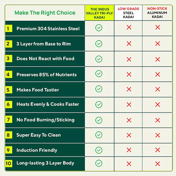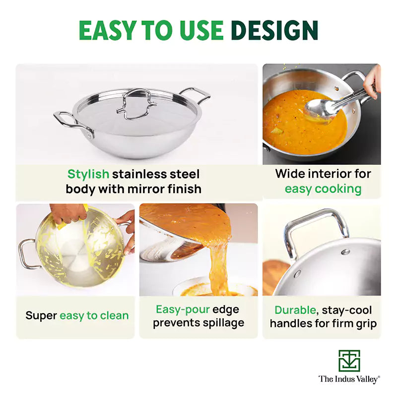 💪100% TOXIN-FREE: The Indus Valley’s TurboCukTM Tri-ply Premium Stainless Steel Kadai/Kadhai with stainless steel lid is 100% food-safe and without any chemical coatings.