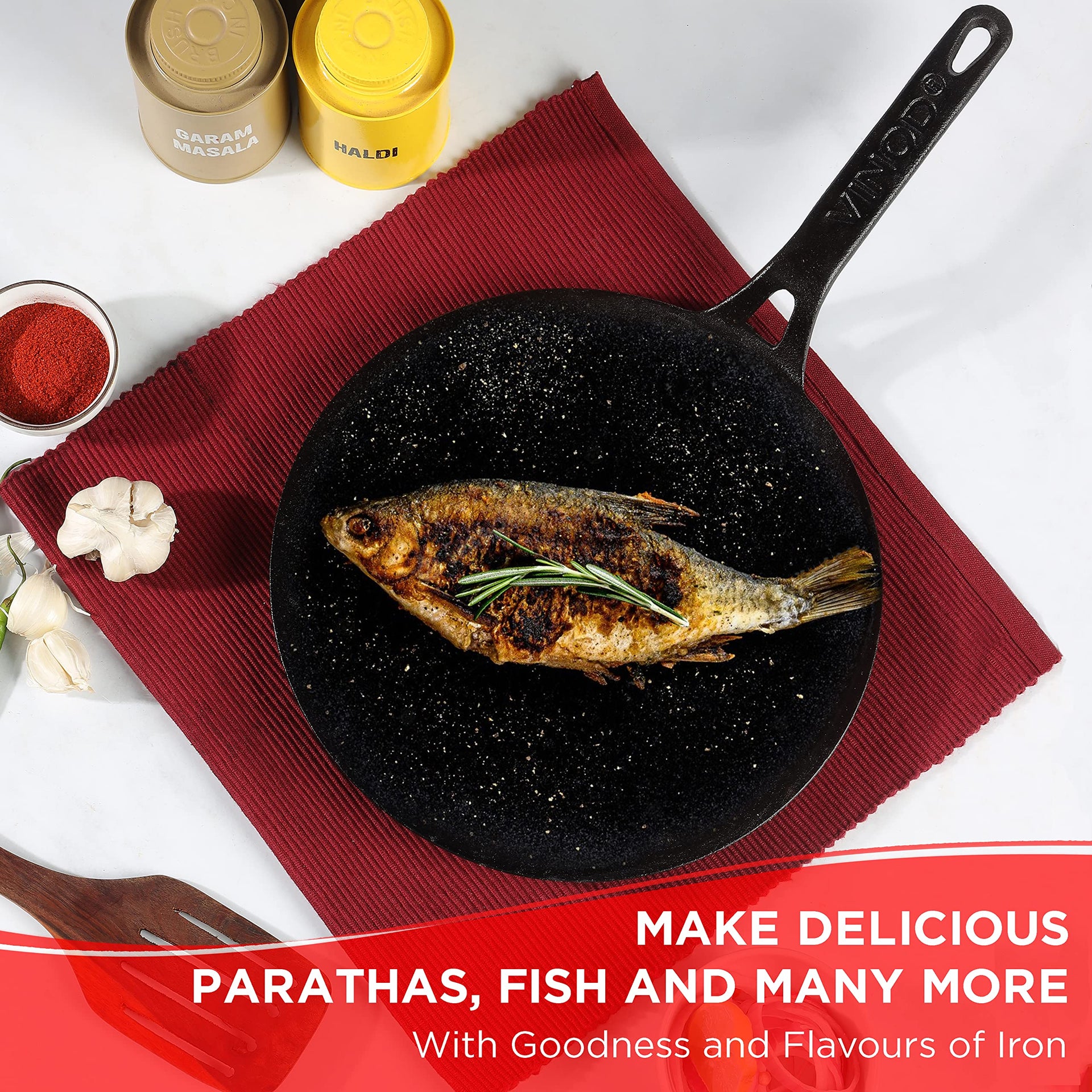 Details: Indian kitchens have honed the cast iron cookware since times unknown. The cast iron cookware can be used on stove tops, grills as well as in the oven which makes it possible to cook a large number of cuisines by using the same cookware. That means minimal space consumption and maximum utility which is just one of the benefits of investing in the cast iron kadai, cast iron tawa or cast iron frypans. Vinod Legacy Cast Iron is Multi-Functional where you can Bake in it, Fry in it, BBQ in it. Perfect for delicious curries, sautΓ©ing, frying, searing, roasting and getting that authentic βcharredβ flavour in your daily cooking