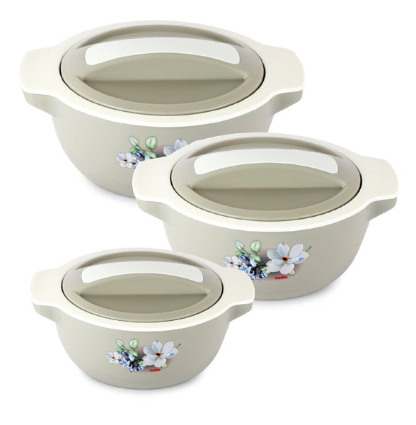 Cello Vista Insulated Casserole Set of 3 is elegant and durable casserole in delightful Peach, soothing Beige, calming Blue, sophisticated Grey, and vibrant Violet designed to elevate your dining experience. Featuring premium insulation, these casseroles keep your food piping hot for longer, ensuring every meal is served with warmth. The versatile sizes cater to various culinary needs, while the sleek design adds a touch of modernity to your kitchen. Crafted with precision, these casseroles are not just cookware; they're an expression of culinary artistry.