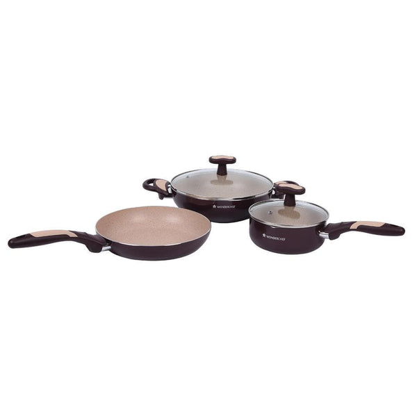 A: Wonderchef Burlington Set pans are made with pure grade virgin aluminium for quick and even heat distribution. They are coated with a health-friendly 5 layer Meta Tuff nonstick coating which is safe for daily use. The pans are strong and long lasting with 2.5mm thickness. They are 100% PFOA free, heavy metal and nickel free for your safety. The ergonomically designed soft touch handles and knob do not heat up during cooking. The pans come with easy clean and care instructions. Wonderchef Burlington Set comes with a reliable Wonderchef Warranty of 2 years. The cookware set of 3 (wok, fry pan and saucepan) looks elegant in the kitchen and on the dining table with the dual tone muted colours and seamless design.