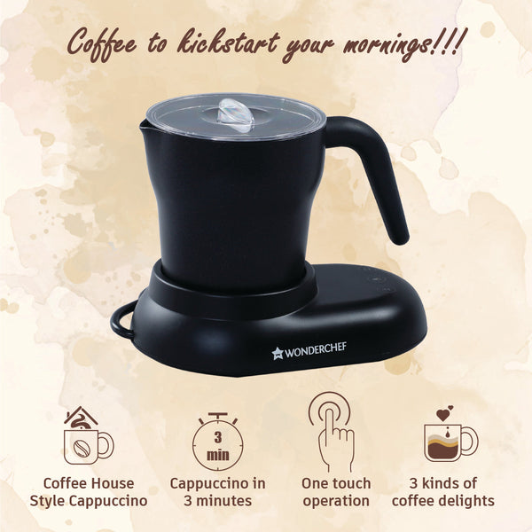 - Wonderchef Cuppaccino Coffee Maker 550W | Coffee Machine for Home | Cappuccino from Instant Coffee in 3 Minutes | Professional Grade Froth | Hot Chocolate, Cold Coffee | Induction based brushless movement | 2 Years Warranty | Black