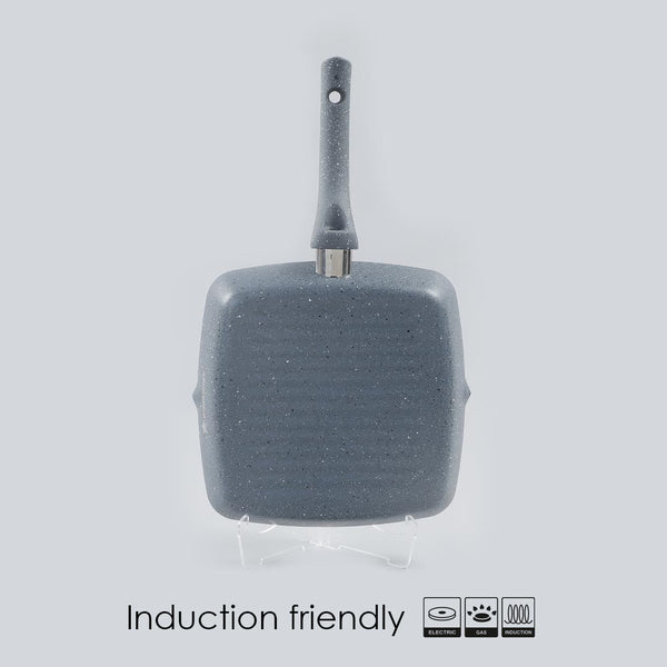 A. Wonderchef Granite Grill Pan is a designer forged pan made with pure grade virgin aluminium for quick and even heat distribution. It is ideal for everyday cooking and the grill pan is a great alternative to outdoor grilling. The perfect solution to cooking healthy, low fat and delicious meals at home. It is strong and long-lasting with 3.5mm thickness. The long handle is ergonomic and gives a comfortable secure grip. Ergonomically designed soft-touch handles that do not heat up during cooking. It is 100% PFOA free, heavy metal and nickel free for your safety and has a health-friendly 5 layer Meta Tuff non-stick coating for daily use.