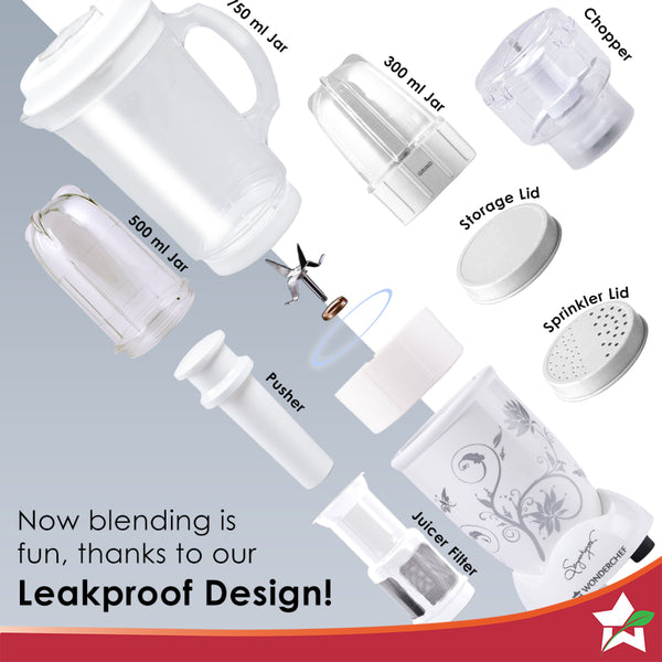 - Nutri - blend CKM (Complete Kitchen Machine) comes with extra attachments – a big 1150 ml Juicer Jar, an exciting 600 ml Chopper, offering an all-in-one solution that functions as a mixer, grinder, blender, juicer and chopper. The Long Jar (500ml) comes with 4-wing blade for mixing-blending and the Short Jar (300ml) with 2-wing flat blade for grinding to make all kinds of chutneys, shakes, smoothies and masalas