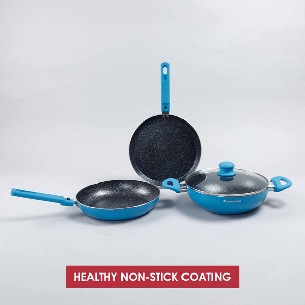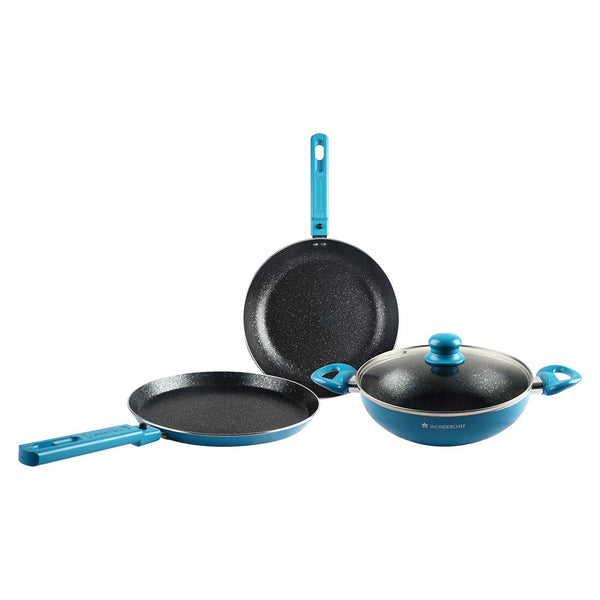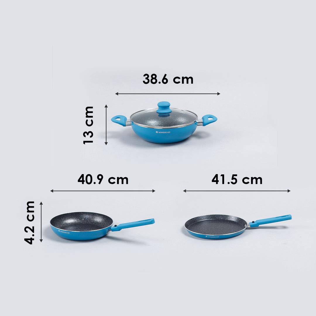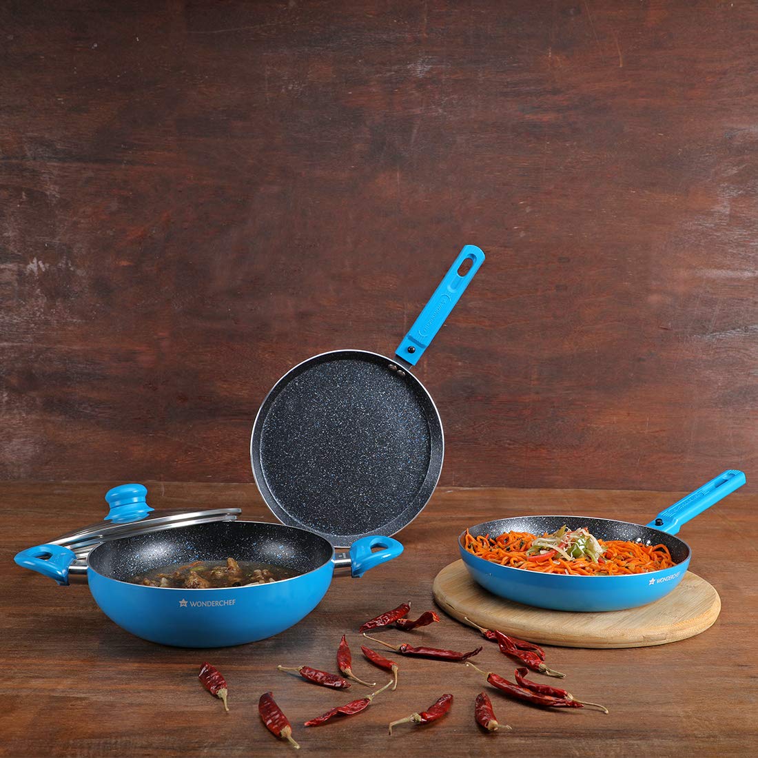 - Versatile 4-Piece Set: Experience the utmost convenience of cooking a diverse array of dishes with just one remarkable cookware set. Wonderchef Power Non-Stick Cookware Set comprises a Kadhai with Lid, Fry Pan, and Dosa Tawa, enabling you to effortlessly prepare an exquisite assortment of cutlets, curries, dosas, omelettes and more.