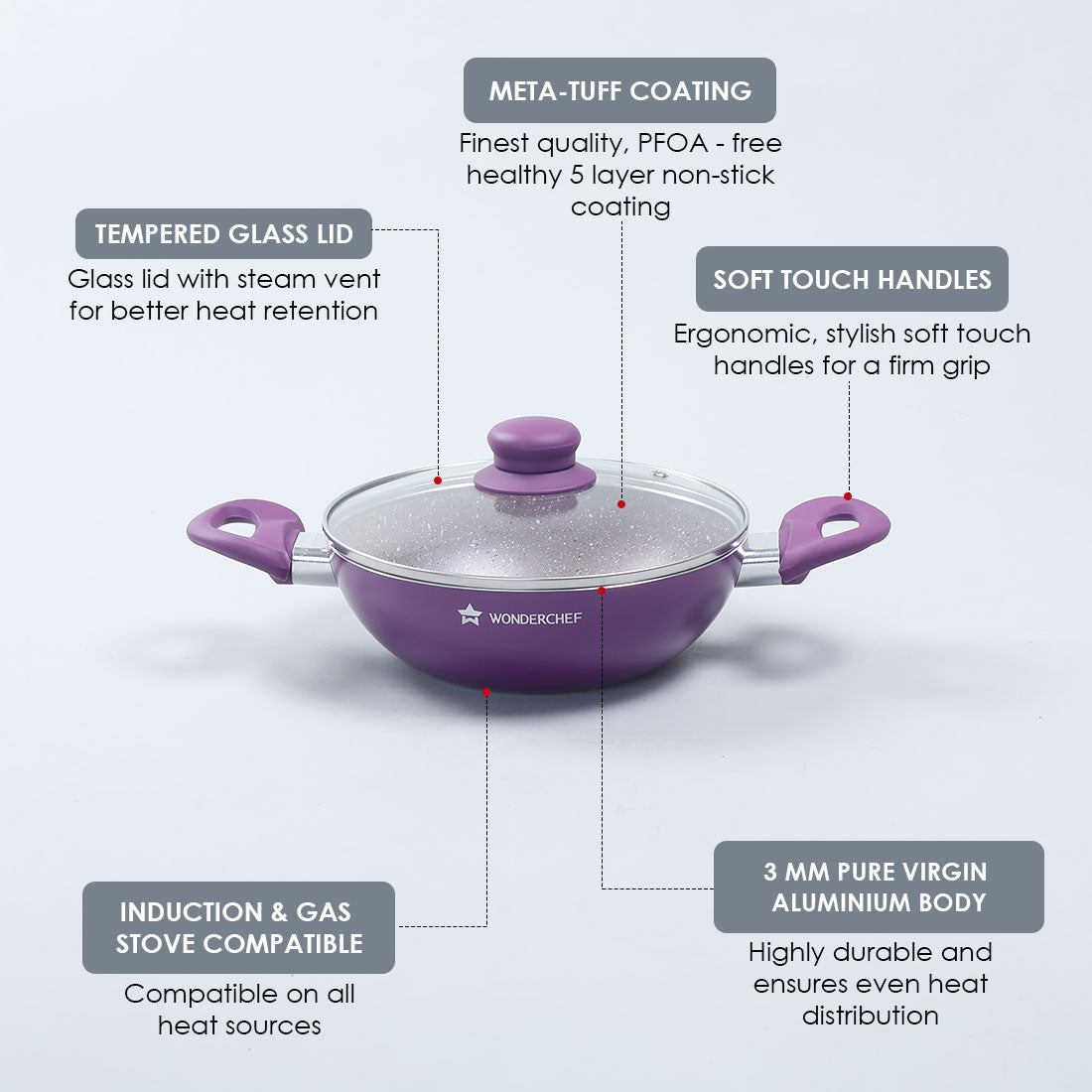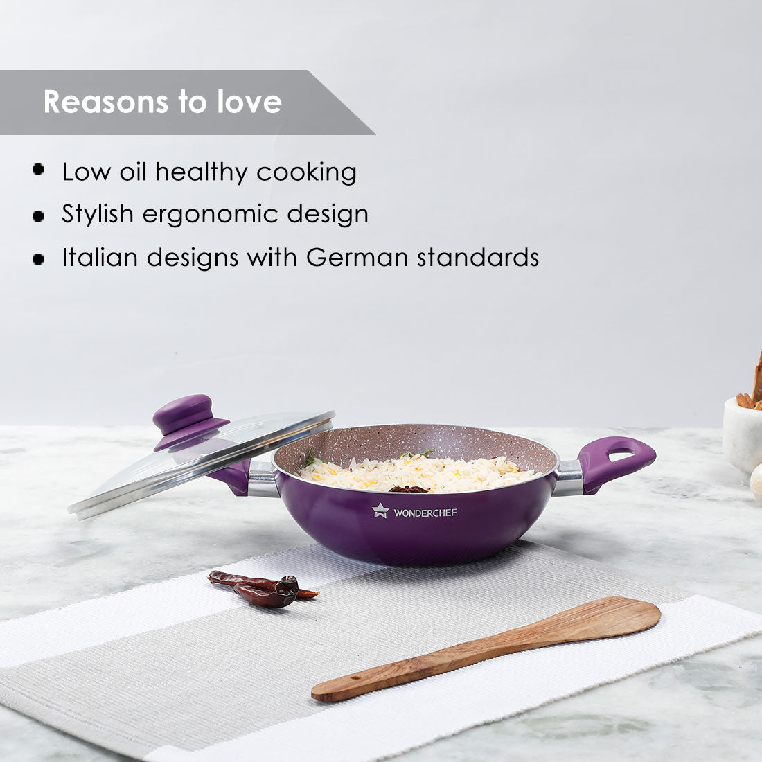 A. Wonderchef Royal Velvet pans are inspired by Italian design and adhere to German quality standards. The pans are made with pure grade virgin aluminium and have a health-friendly 5 layer Meta Tuff non-stick coating. The pans are strong and long lasting with 43 micron thickness. They are well priced and come with a Reliable Wonderchef Warranty 2 years.